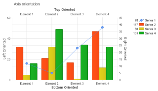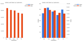 Shows total sales and number of orders from the sample database bound to different axis and also shows how the same chart would appear if bound to the same axis.