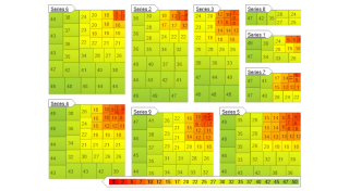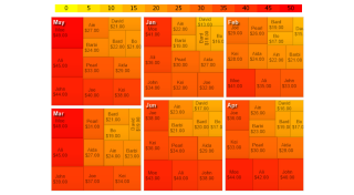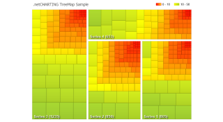 Demonstrates a TreeMap chart where each series uses a different color range to color encode the element values.