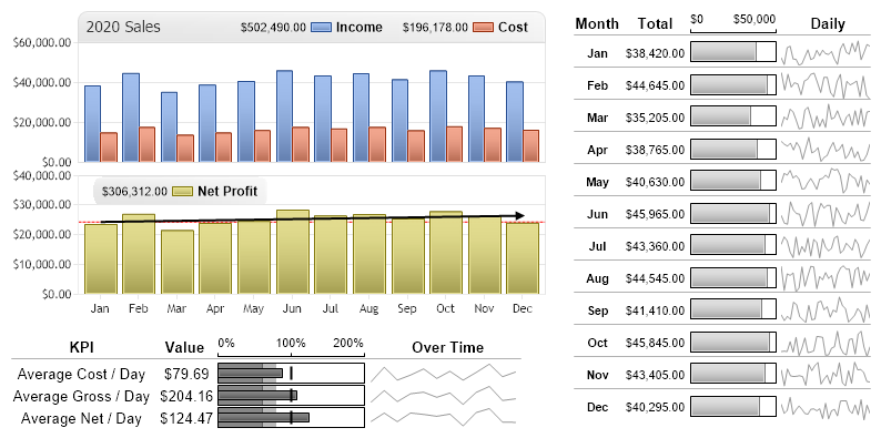 // Demonstrates a database driven digital dashboards utilizing a number of chart types including InfoGrids and MicroCharts.