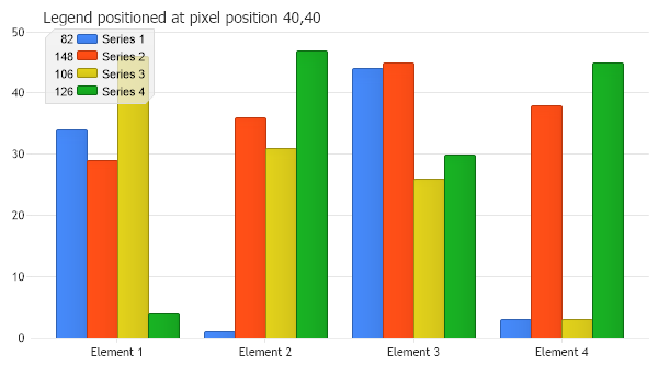 Chart.Title = "Legend positioned at pixel position 40,40";