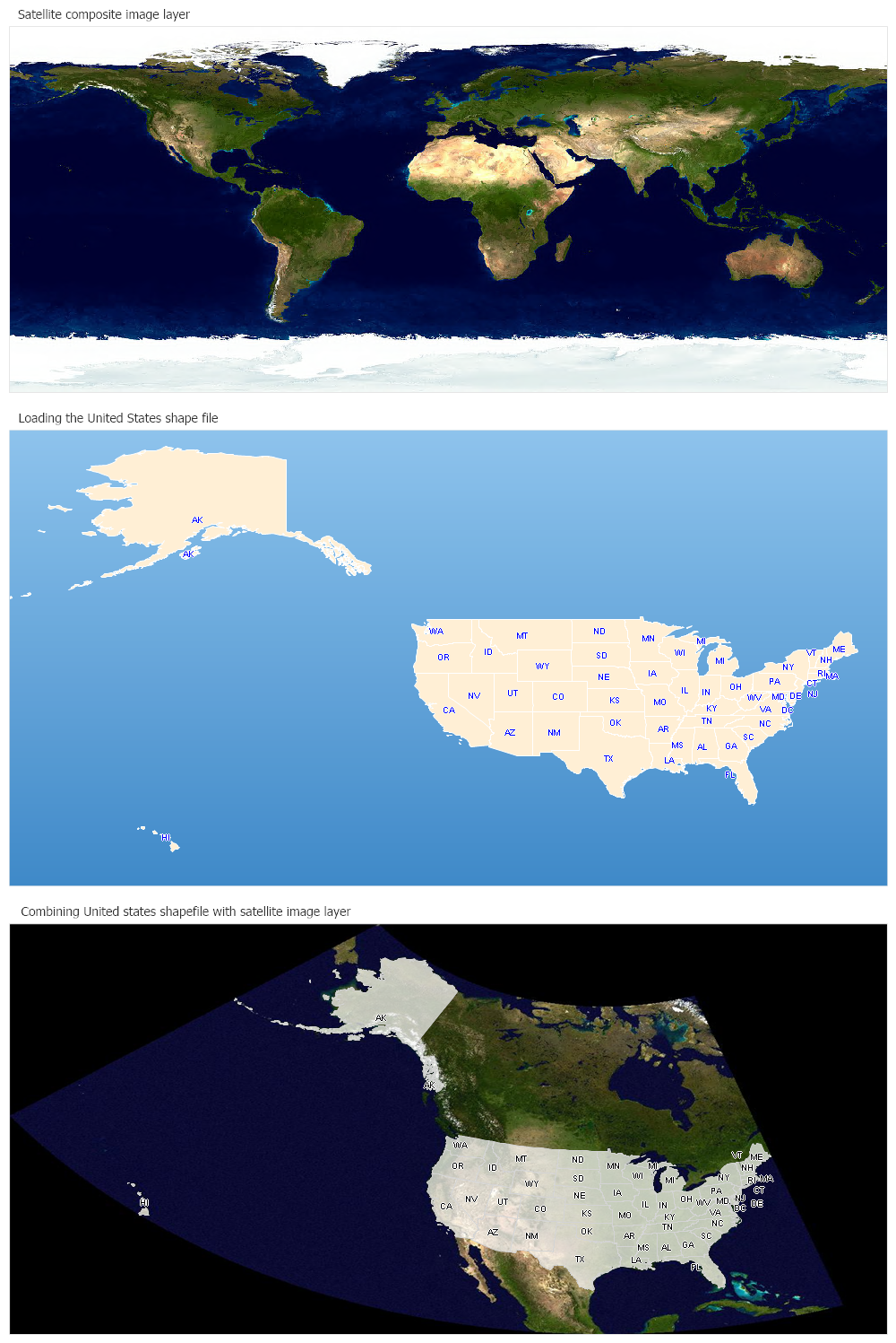 Chart3.Title = "Combining United states shapefile with satellite image layer"