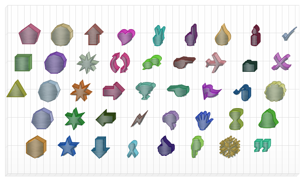 Dim shapeNames As String() = New String() {"Triangle", "Cube", "Pentagon", "Hexagon", "Heptagon", "Octagon", "Nonagon", "Decagon", "FivePointStar", "SixPointStar", "SevenPointStar", "EightPointStar", "ArrowUp", "ArrowDown", "ArrowLeft", "ArrowRight", "Refresh", "Heart", "Ribbon", "Zap", "Trophy", "Chat", "Peace", "ThumbsUp", "ThumbsDown", "PointLeft", "PointRight", "PointUp", "PointDown", "Hand", "Flag", "Plane", "Drop", "Flake", "Hourglass", "Mouse", "Folder", "Candle", "Quote", "Bell", "Clover", "X", "Check" }