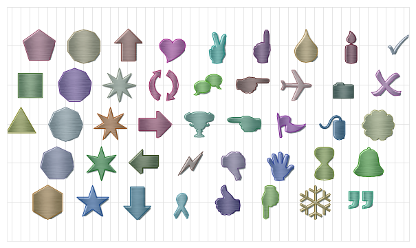 Dim shapeNames As String() = New String() {"Triangle", "Cube", "Pentagon", "Hexagon", "Heptagon", "Octagon", "Nonagon", "Decagon", "FivePointStar", "SixPointStar", "SevenPointStar", "EightPointStar", "ArrowUp", "ArrowDown", "ArrowLeft", "ArrowRight", "Refresh", "Heart", "Ribbon", "Zap", "Trophy", "Chat", "Peace", "ThumbsUp", "ThumbsDown", "PointLeft", "PointRight", "PointUp", "PointDown", "Hand", "Flag", "Plane", "Drop", "Flake", "Hourglass", "Mouse", "Folder", "Candle", "Quote", "Bell", "Clover", "X", "Check" }