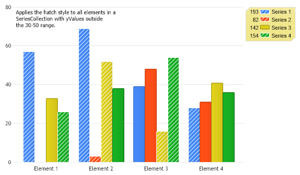 Chart.ChartArea.Label.Text = "Applies the hatch style to all elements in a \nSeriesCollection with yValues outside \nthe 30-50 range.";
